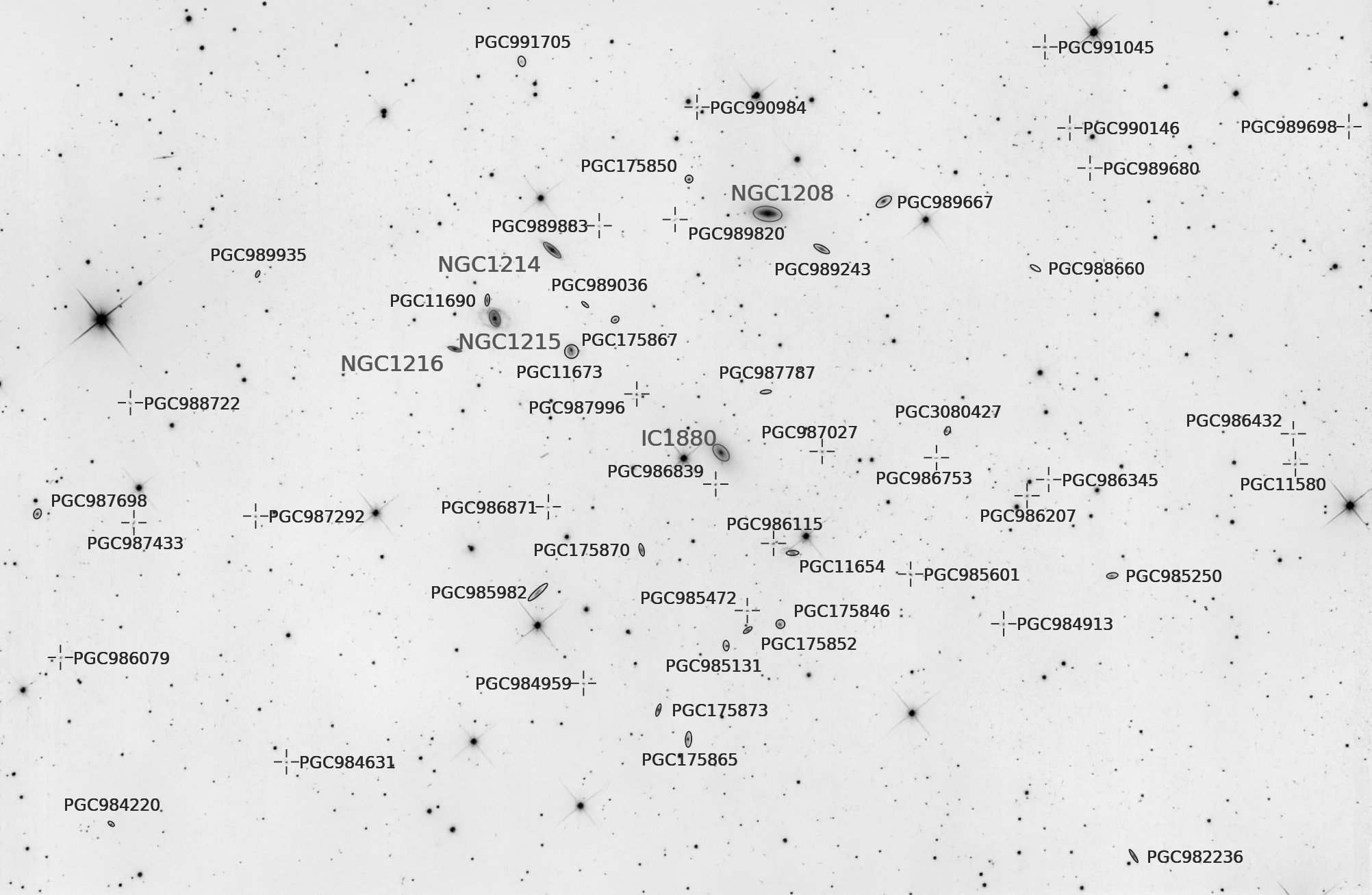 Annotated | 0bject | Hickson 23 Galaxy cluster in Eridanus NGC 1208, 1214, 1215, 1216, IC 1880) |