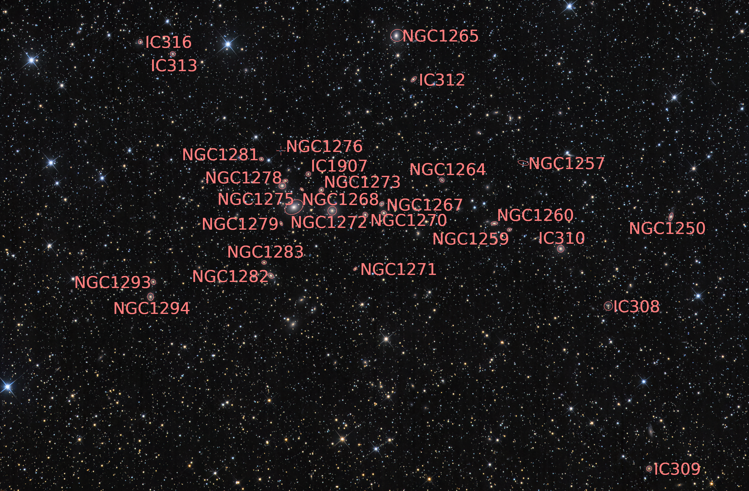 Annotated| 0bject | NGC 1275 and other galaxies in Perseus |